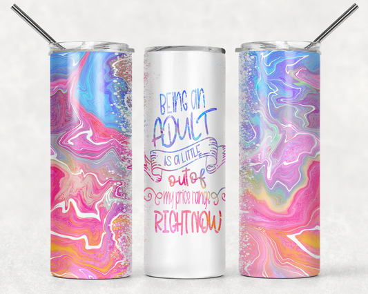 Sublimated 20 oz Tumbler - 'Being and Adult is a Little Out of My Price Range Right Now' design