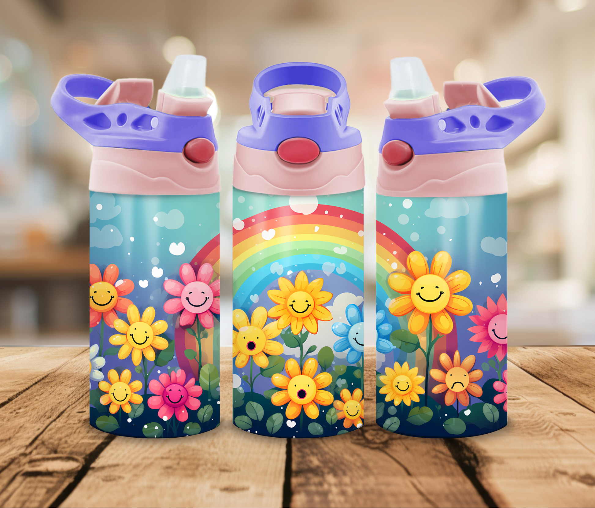 12 oz Sublimated Sippy Cup or Kids Tumbler with Flower Faces and Rainbow design