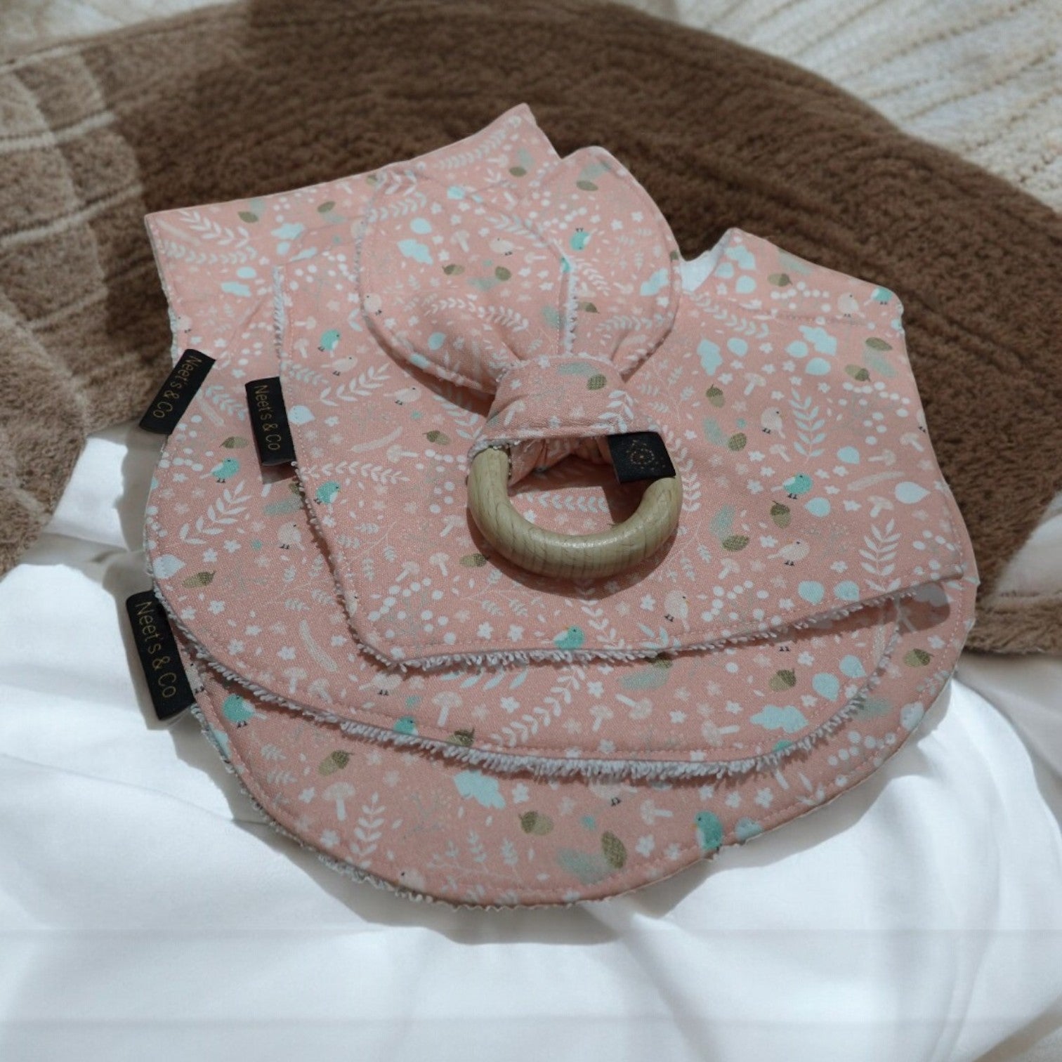 Bundle up for mealtime with our Baby Bibs, Burp Cloth, and Teether Bundle! Adorned with a delightful pattern of baby birds, mushrooms, and leaves on a salmon background, this bundle is perfect for your little one aged 3 -18 months. Keep your baby clean and entertained while adding a touch of charm to their outfit. (Bibs are a bird's best friend, but not for eating!)