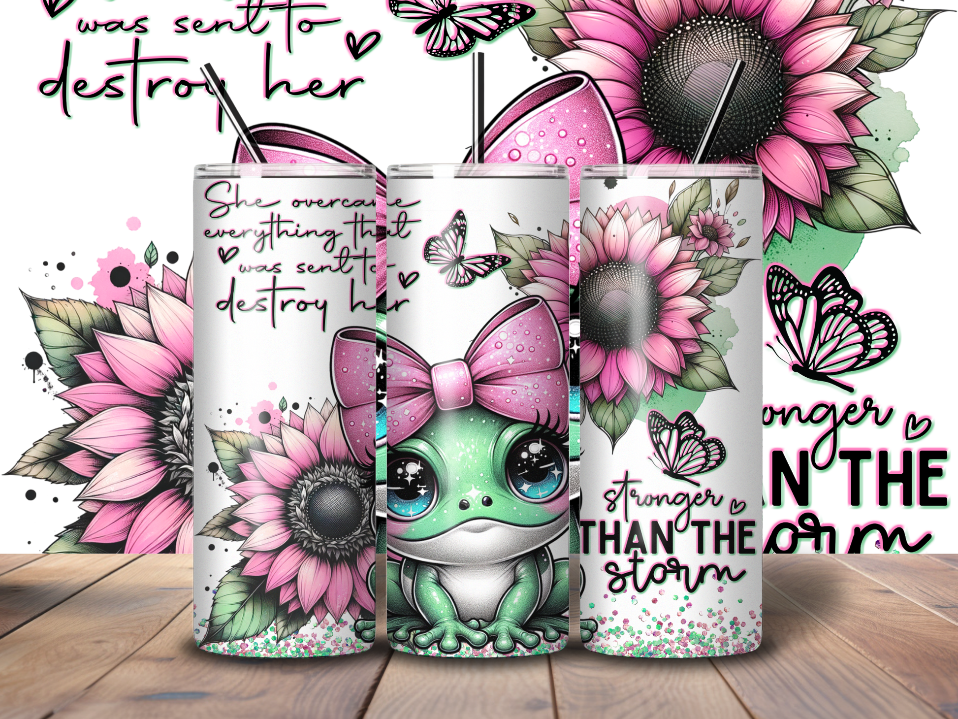 Introducing our Sublimated 20 oz Tumbler - Baby Green Frog Affirmation Design! Let this cute green baby frog remind you that you are "Stronger Than The Storm". Perfect for keeping your drinks hot or cold on the go. Make a statement and stay hydrated with this charming tumbler.